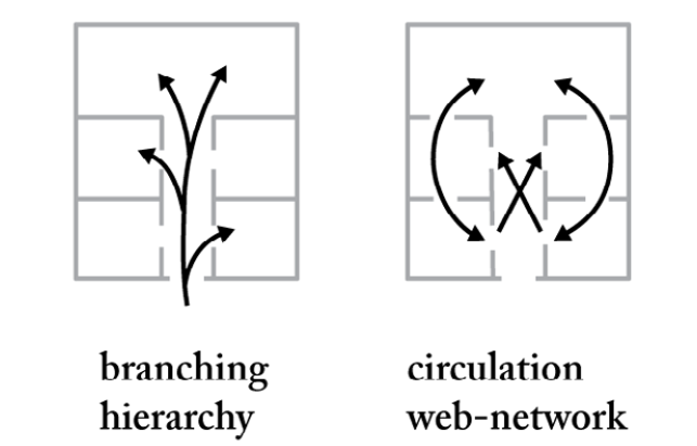 Left, a branching hierarchy, with little interaction between the spaces, and little life. Right, a web-network that allows connection and circulation in a complex pattern that is far richer.