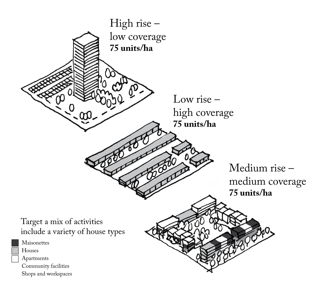 Three very different urban forms at very different heights — yet they all achieve precisely the same density. Many people fail to understand that tall buildings are commonly placed very irregularly, typically between large unwalkable areas of green space, parking lots, or low buildings, with little or no net increase in density over other possible forms. Source: UK Urban Design Task Force, 1999.