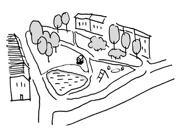 __Therefore: Within the sanctuaries, create neighborhood parks that serve as quiet oases for residents, with ample greenery and natural characteristics such as ponds and waterfalls. Assure that one of these parks is within about 200 meters (650 feet) of every residence. Provide for recreational activities including play structures for children. Provide sheltered spaces for activities including acoustic music and small neighborhood gatherings.__
