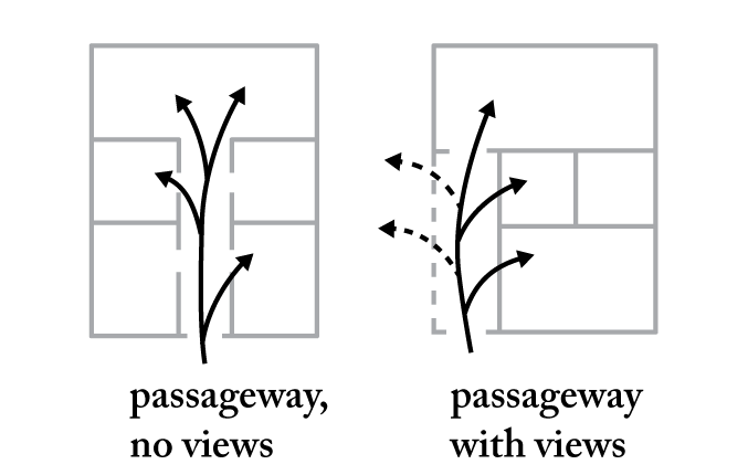 __Therefore: Do not make long, dark passageways that offer no views to the exterior. Instead, connect at least part of each passageway to the exterior, offering views from windows.__