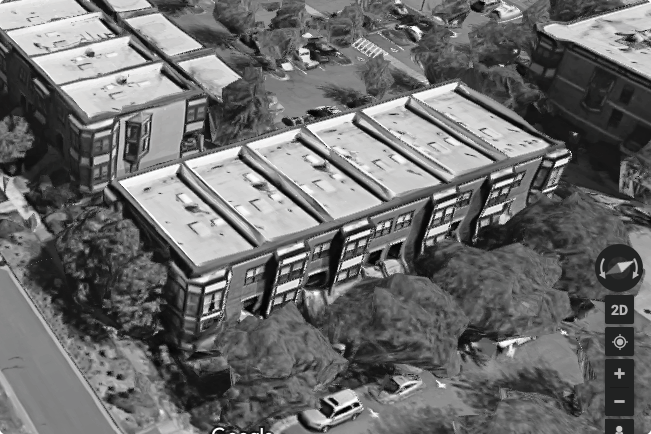 The rowhouses of Orenco Station in Oregon form perimeter buildings, with 12 foot (3.7 m) outdoor terraces as well as small 4 foot (1.2 m) yards forming a double layer of semi-private front space along the streetscape.