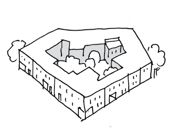 Perimeter buildings can also be used to provide blocks-of-blocks — that is, smaller perimeter buildings within the larger block that in turn enclose smaller spaces such as courtyards, gardens and so on. Such a structure can be seen at the upper left of the photo at the beginning of this pattern.²