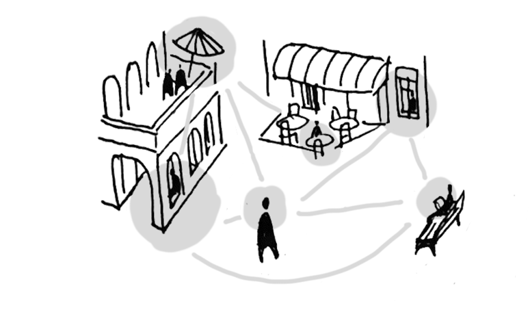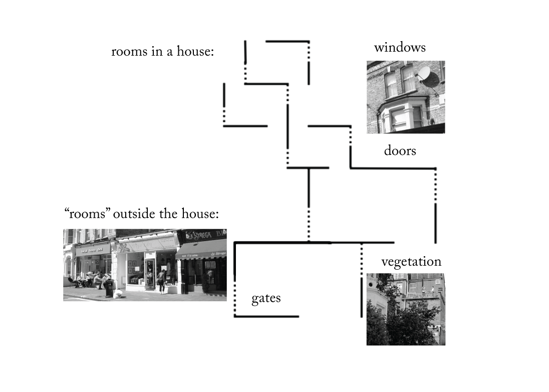 __Therefore: When planning a building, a street or other parts of an environmental structure, conceive of them as part of a tapestry of places — a place network. Work to articulate these places as part of a continuous network with many connections, and many points of modulation of connection: doors, windows, gates, hedges, fences and other structures.__