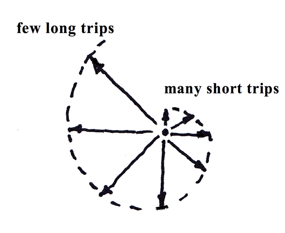 Discussion: We can see that where cities and towns have developed in a more natural pattern — especially prior to the automobile — there has been a remarkably regular distribution of city sizes, with a few large urban centers, many smaller satellite towns, and a medium range of mid-size settlements, often suburban town centers. Similarly, most residents in these areas make a great many short trips — for example, daily trips to a nearby grocery store or to school — as well as a few long trips, perhaps to a major cultural event in another town. In between these extremes, they make a medium number of medium-size trips — for example, trips to work. This range of trip lengths could be illustrated this way: