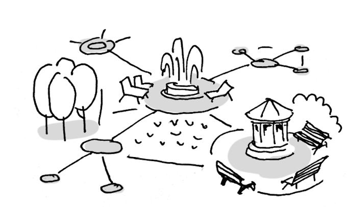 Today we are gaining a clearer evidence-based understanding of the role of urban space, in comparison to the heady days of post-war planning that privileged the automobile. We see that a healthy city connects a fractal distribution of urban spaces (i.e. a few large ones, more intermediate-size ones, and very many small ones) via a protected set of pedestrian paths (public spaces in their own right) to create a pedestrian web-network. The larger public spaces appear as the ‘beads’ in a complex kind of ‘necklace’. Each larger public space needs specific factors to make it work, however. It must (i) be semi-enclosed by a perimeter of attractive building façades with many entrances; (ii) be ‘fed’ by pedestrians coming from several surrounding blocks of mixed residential and commercial use; (iii) embed a path structure that crosses the plaza and is not cut by sculptures, street furniture, changes of level, or pools of water (these elements should instead be placed strategically so as to define and reinforce the cross-paths); and (iv) have at least one side that is strictly pedestrian.³