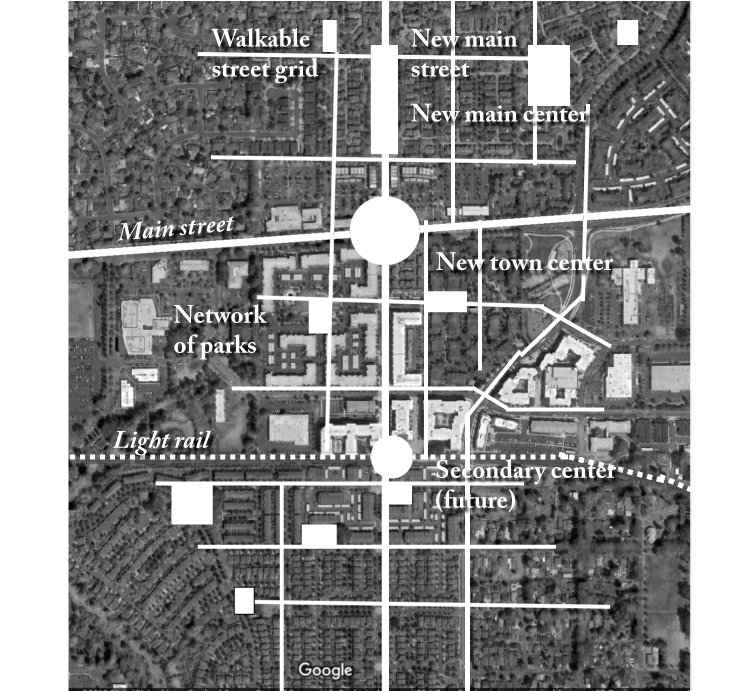 A network of large, medium and small public spaces, well-connected to each other and within 200m (750 feet) of all homes, in a new development on the Portland OR light rail line.