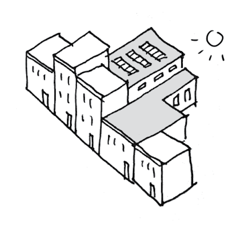 There is another serious problem for many row buildings, which is the amount of natural light that enters the building. The narrower and deeper the building, the less light will enter its interior (except by skylights and light wells, which are of limited benefit). One solution is to jog either the front or back wall of the building, to create an “L” shape. Another solution is to create small courtyards or light wells that bring light into the interior. A third solution, and the simplest, is to keep the depth of the building quite shallow, while the width is greater — at least 6 meters or 20 feet, or wider.¹