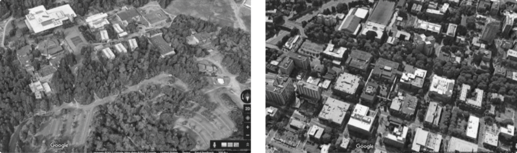 Left, an isolated and boring university “supercampus” in Olympia, Washington, and right, a lively campus integrated into the urban fabric of Portland, Oregon. The latter campus is in a walkable, bikeable setting, and served by streetcar and other transit.