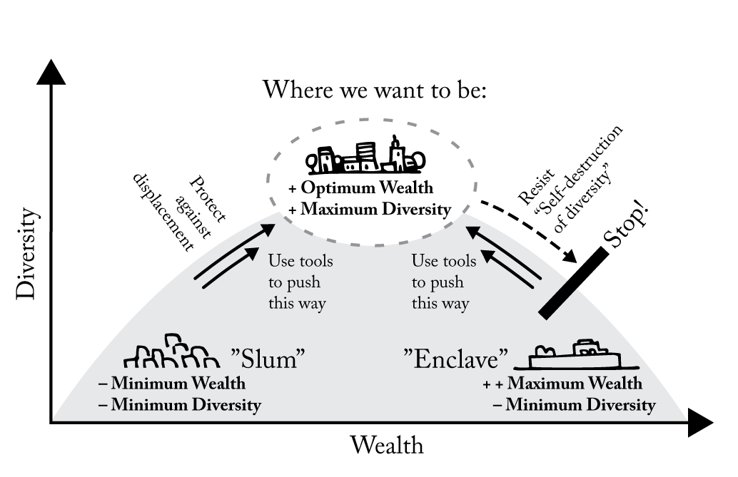 The “Jacobs Curve” shows an optimum point of diversity reflecting a mix of incomes, Anything on either side of this “Goldilocks zone” — either too much poverty, or too much wealth — is bad for the neighborhood.