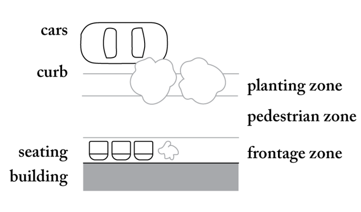 Discussion: Along streets, pedestrians need ample space to walk, and to pass other pedestrians who are walking in the other direction or standing briefly. This pedestrian travel zone will vary depending on the population of the area, but in general it is a minimum of 1.5 meters, or approximately 5 feet. More ideally it is at least 3 meters, or 10 feet. In addition, there is a need to accommodate seating areas and commercial elements such as planters and signage, which generally require another 1.5 meters or 5 feet. Finally there is a need for a zone for street trees, light poles and other elements, which require approximately 1.5 meters or 5 feet. Altogether, the space for the pedestrian right of way should be at least 4.5 meters or 15 feet, and more typically 6 meters or 20 feet, not including any additional yard space for adjacent buildings.